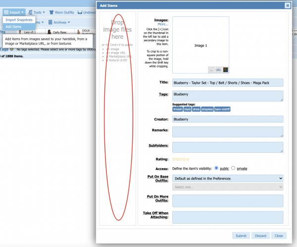 Must I upload them in eaches (time), or is there a way to drag-drop many in a single motion (either from sl inventory, or from my hdd) given that they are all full perm, and all renamed to auto-catch tags?