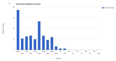 Visit durations displays how many visitors stayed for how long. In this example chart you can see that most of the people stayed for up to two minutes. The majority of people who stayed longer than that stayed about from 10 minutes.