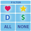 E.g., if you only want to see only the lookmarks with the heart rating, make sure only the heart button is active on the filter. Or if you want to see the items you've got demos for that you like (that have a star rating), activate the "Demo" and the "Star" buttons (but not the others).
