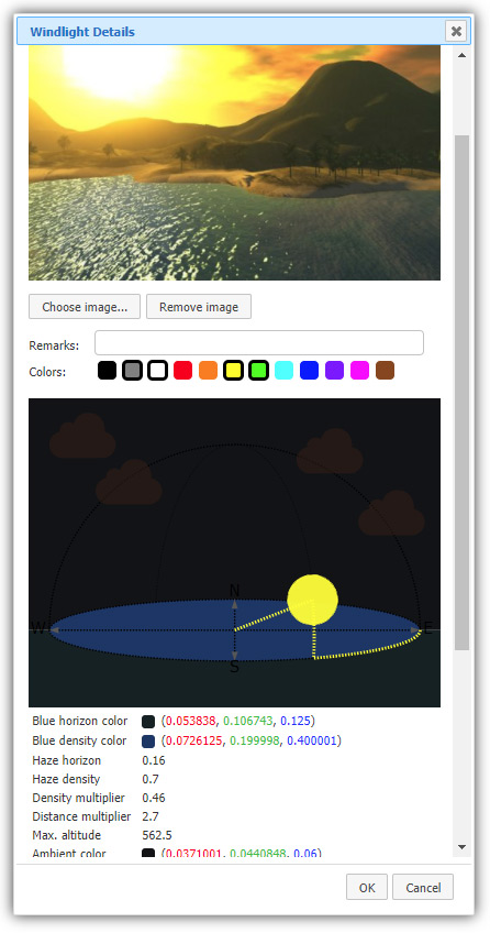 The dialog also displays a schematic diagram, that depicts the sun/moon position and the various colors associtated with the preset, as well as a visualization of the cloud density.