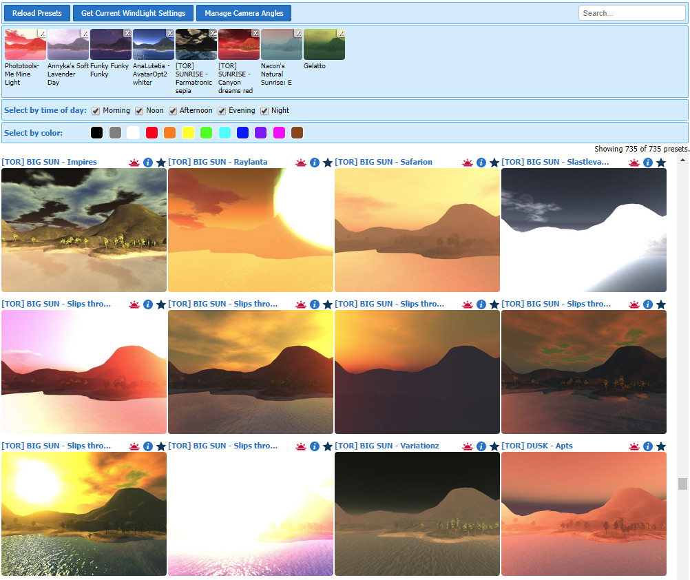 Your personal Skylight web page displays the WindLight presets. It comes pre-loaded with the ones that come with the viewer by default and are searchable by name, time of day, and color.