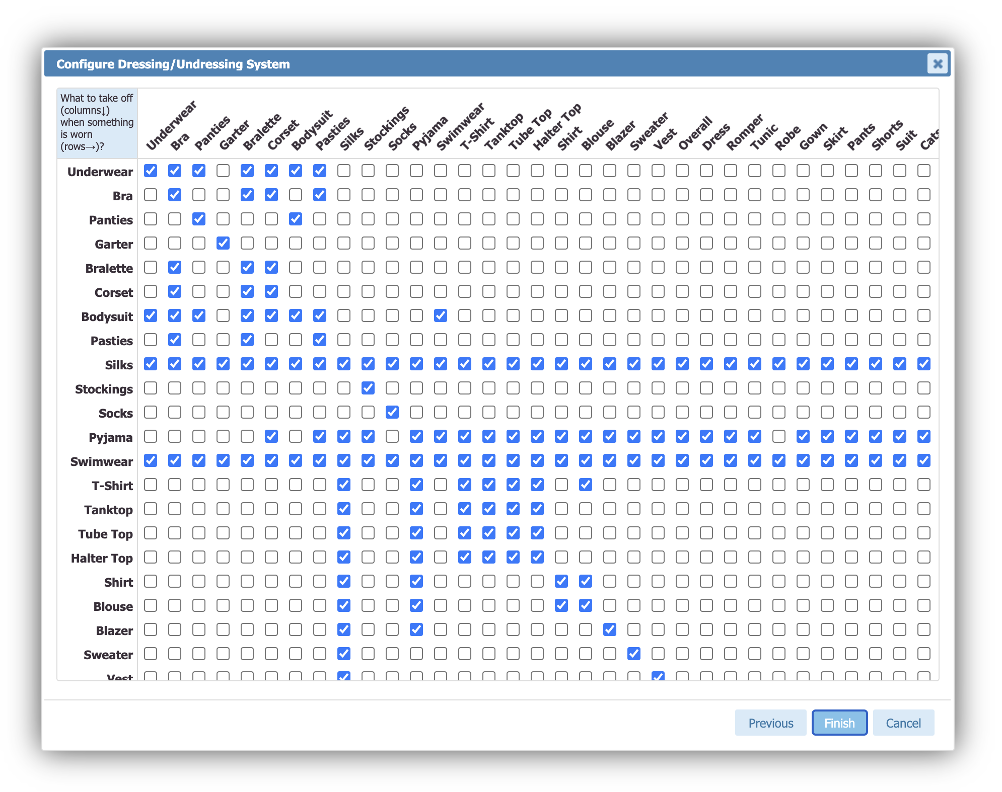 In the example to the right, consider the first row labeled "Underwear", for instance. You can see that the "Underwear", "Bra", "Panties", "Bralette", "Corset", "Bodysuit", and "Pasties" columns are checked, which means that whenever you put on an item having a tag corresponding to the "Underwear" clothing type, any item with the clothing types "Underwear", "Bra", "Panties", Bralette", "Corset", "Bodysuit", or "Pasties" will be removed first.