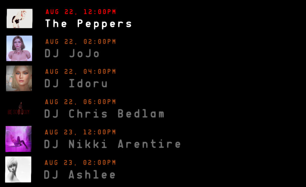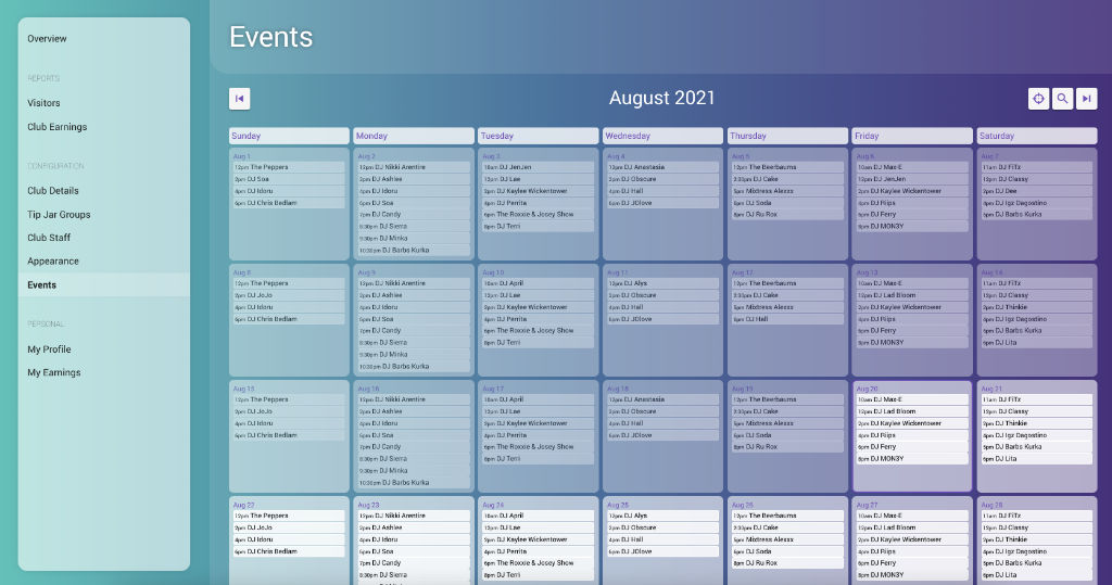Event board, showing the current and upcoming events with the profile image of the main entertainer