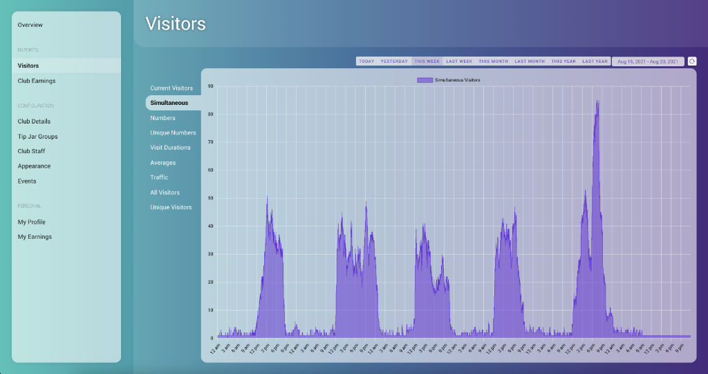 Entertainers can view earning statistics (list of tips and tippers, aggregated tip amounts, tip amount statistics, log in times)